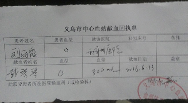 “当时患者失血达2000多毫升(相当于人体一半血量),手术用血量大,医院库存血已不够用。”手术室护士长黄静说,义乌市湖北商会秘书长郭容得知情况后,立即将刘女士的病情及急需O型血的信息在QQ群里发布,动员老乡奉献爱心。刘女士的病情顿时牵动了众多在义乌经商的湖北乡亲。